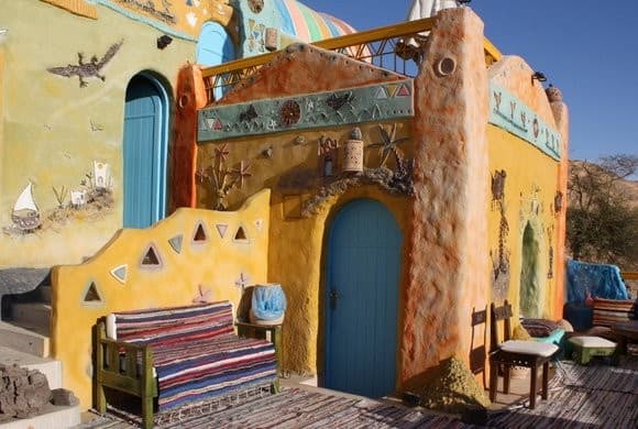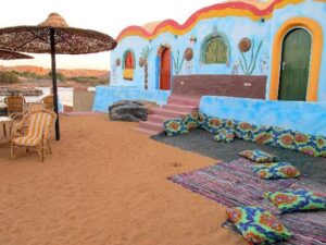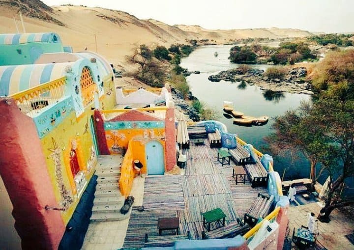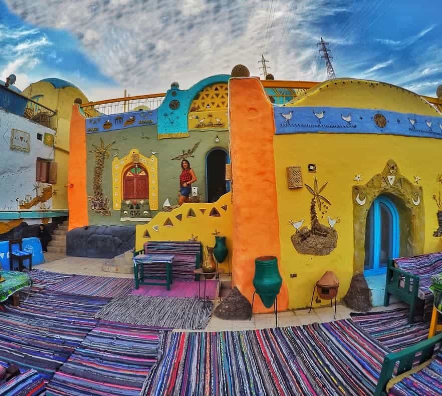 فندق انا كاتو ، أحد أفضل بيوت الضيافة في أسوان وحينما ننظر يتذكر الجميع كارتون الأطفال الشهير «بكار» بالكثير من الشوق والسعادة، حيث الأصدقاء الطيبين، والبيوت النوبية المميزة، بألوانها الزاهية والطرقات الممهدة، والنيل المحيط بكل شىء، غاب الكارتون، وغاب الخيال، لكن «أنا كاتو» عاد ليذكر الجميع بالجو الكارتونى المميز والنوبى الأصيل عبر مجموعة من التصميمات الكارتونية اللافتة. «لما باخد الزوار فى جولة أولية فى الفندق، بقولهم أهلاً بيكم فى بيت الكارتون» تقولها شيماء غالب، القائمة على استقبال الزوار، شابة نوبية تحب عملها فى مجال السياحة واستقبال الزوار من شتى الجنسيات، تعلم أن الفندق الذى عاصرته منذ بدايته، ليس فى حجم أو إمكانات الفنادق الضخمة الشاهقة ذات حمامات السباحة، والرخام الفاخر والأغراض اللامعة، لكنه نوبى، من بيئتها، يحمل تاريخ ملامح أجدادها.